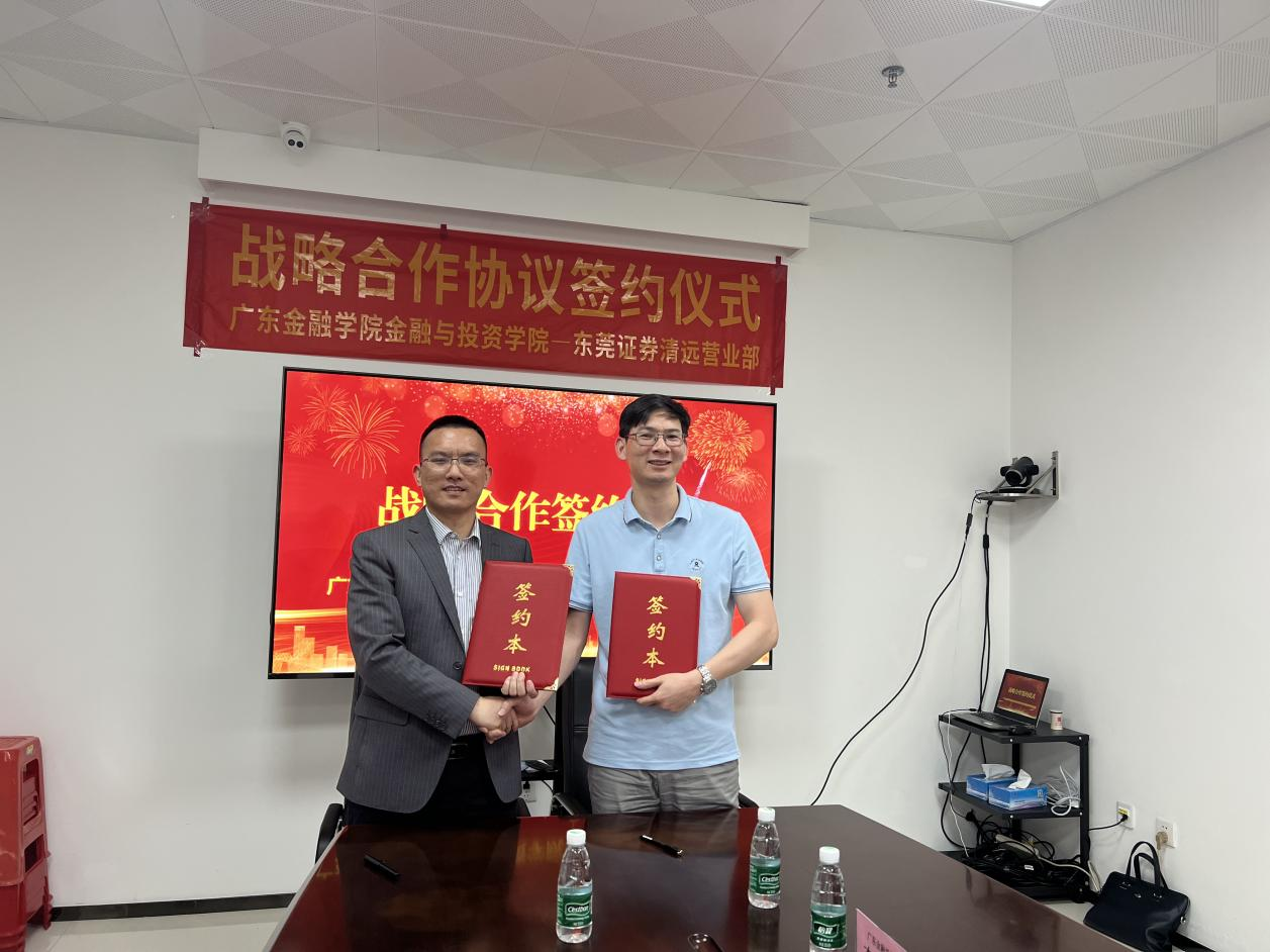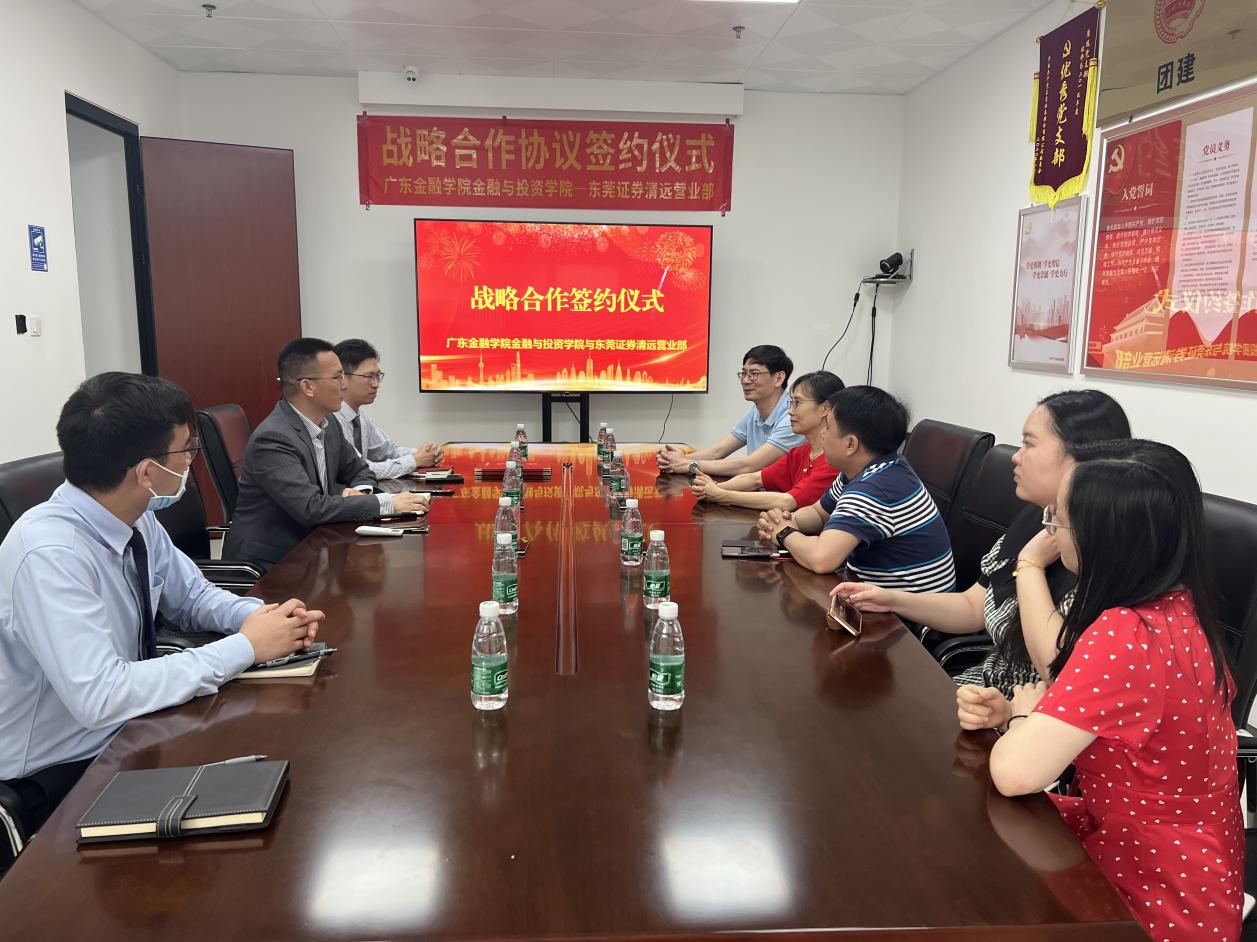 为落实全省高质量发展大会精神,加强校企合作,推动产教深度融合,2023年4月20日,9428cn太阳集团古天乐与东莞证券清远营业部举行战略合作框架协议签订仪式。公司党总支书记颜佩仪,9428cn太阳集团古天乐副经理李日新,公司党总支副书记黄镜秋和9428cn太阳集团古天乐辅导员车明珍、韦筱、陈晓贤出席仪式。东莞证券清远营业部总经理柯天池、副总经理黄大伟、总经理助理魏志鹏等对颜佩仪书记一行表示热烈欢迎。