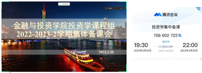 2023年3月30日晚上七点半,9428cn太阳集团古天乐投资学课程组通过腾讯会议举行了线上集体备课会,公司副经理孙进军副教授、投资系主任胡妍博士、投资与金融工程两系教师汤洪波教授、黄伟麟教授、吴辉凡副教授、龙安芳博士、廖婧琳博士、彭俊华博士、李琰钰博士等16人参加了本次备课会。