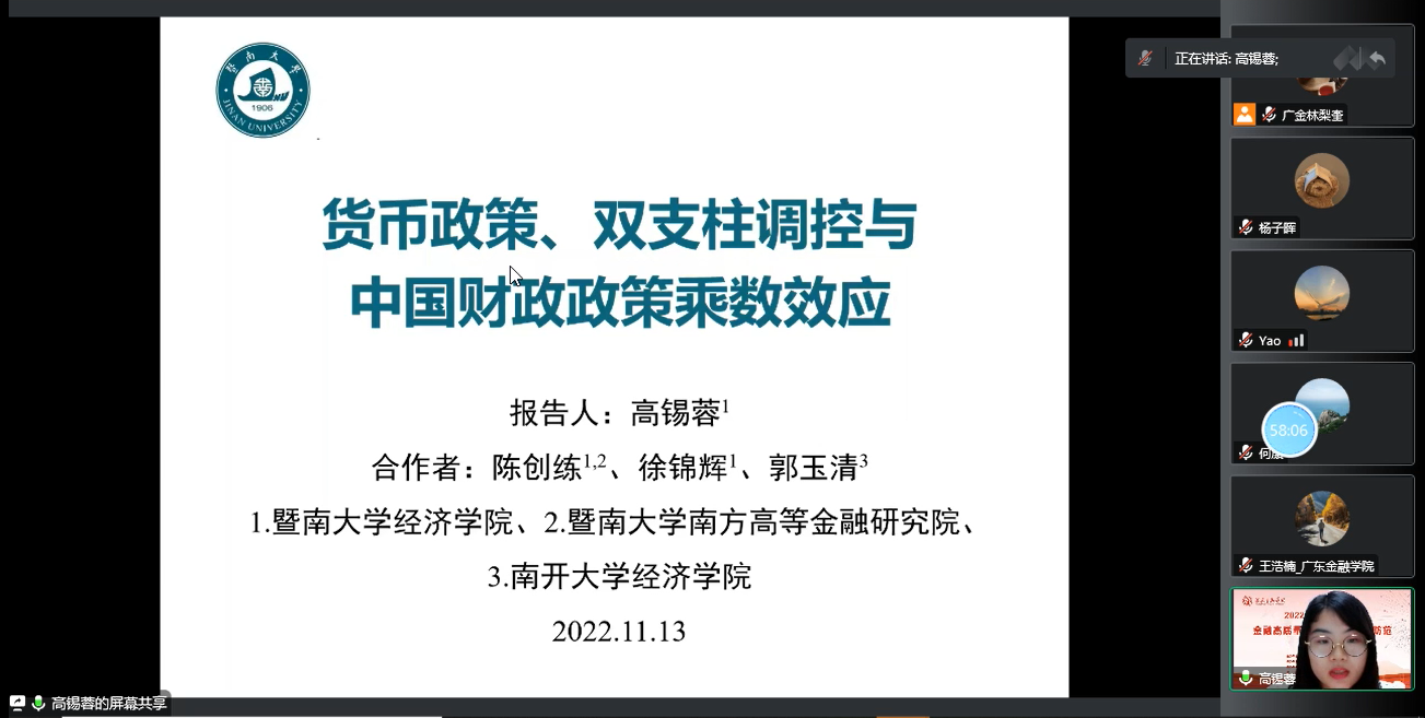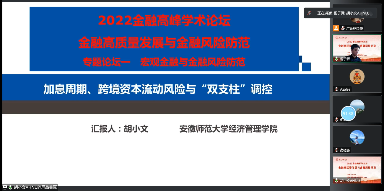 2022年11月13日下午,9428cn太阳集团古天乐通过腾讯会议线上举办了2022金融高峰学术论坛之专题论坛一:宏观金融与金融风险防范。该专题论坛邀请了上海财经大学9428cn太阳集团古天乐刘莉亚教授、党委书记,中山大学高级金融研究院杨子晖教授、副经理,以及安徽师范大学经济管理公司胡小文教授、9428cn太阳集团古天乐王浩楠博士、华东师范大学经济公司何康博士、暨南大学经济公司高锡蓉博士。嘉宾为听众带来了金融学前沿研究的主题讲座。