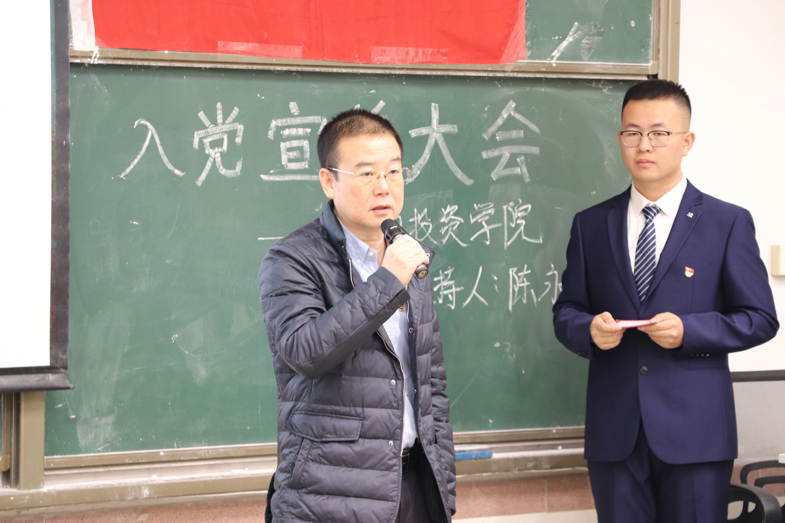 接着,新发展的党员出席了入党宣誓大会并集体高唱《国际歌》,黄镜秋老师带领新党员进行庄严宣誓。之后,新党员代表赵泽权同志上台发言,他提到,成为中共党员不仅是荣耀,更是责任,党员应当起到先锋模范作用,还引用了习近平主席在庆祝改革开放40周年的重要讲话“船到中流浪更急,人到半山路更陡”来勉励大家,要在实现中华民族伟大复兴的道路上不断前行。随后,老党员代表洪妍同志发言,她认为党员应当努力践行入党誓词,认真学习马克思主义真理,增强党性;同时要不忘初心,牢记使命,不能脱离、忽视群众;应当逢山开路,遇河架桥,将党的十九大蓝图变成现实。