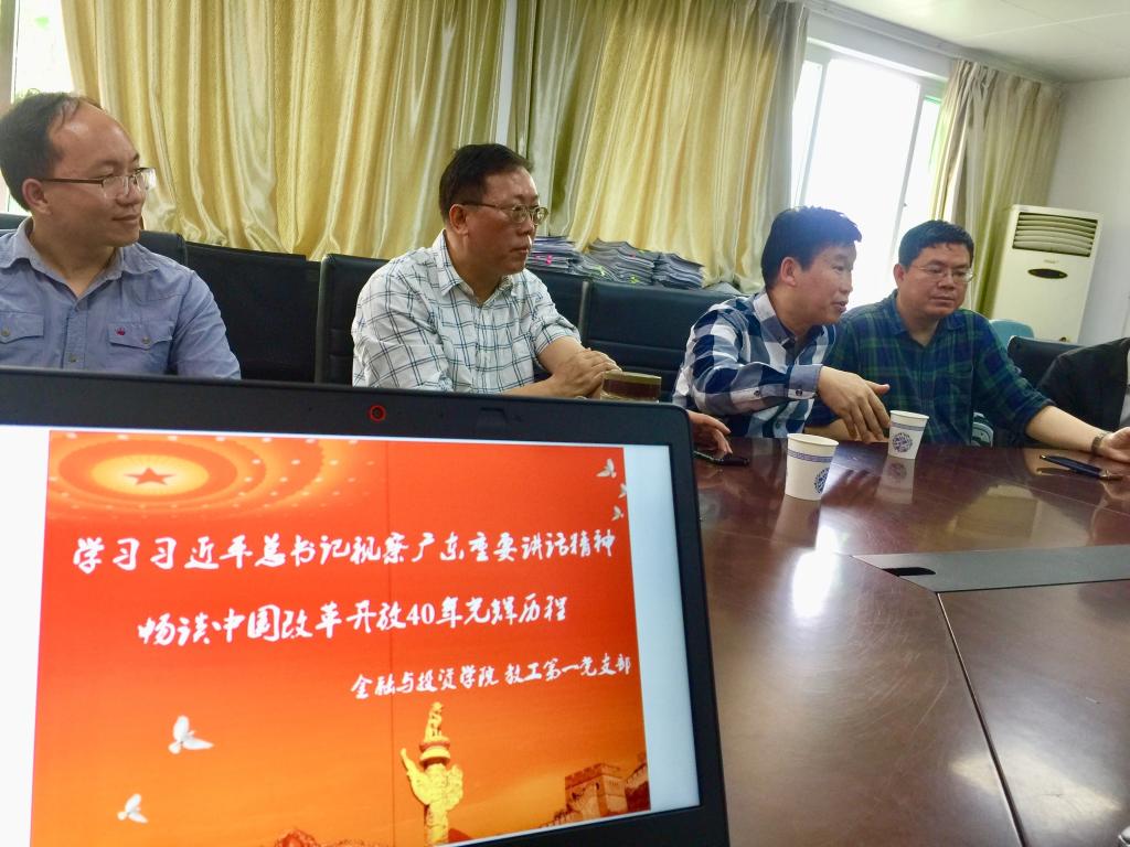 观看完视频后,王醒男董事长发表了讲话,他指出作为教经济、金融的老师要以身作则,多学习习主席的讲话精神,多看历史书,以史为鉴。改革开放四十年,虽然还存在一些不尽人意的地方,但巨大的成绩也摆在我们面前,谁都不会希望中国乱。因此,落实到实际工作中,就应该做好本职工作,把教学科研工作做好,要学会享受工作,把平凡的工作做好就是不平凡。