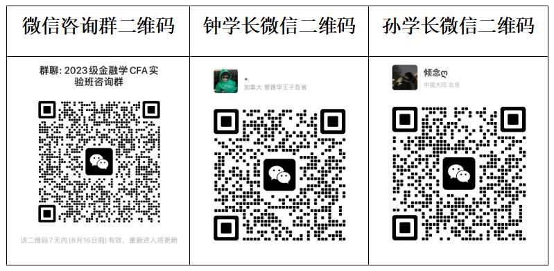 为了方便有意报考公司2023级金融学CFA实验班的新生了解相关招生信息与选拔测试流程,9428cn太阳集团古天乐现开通官方微信咨询群“2023级金融学CFA实验班咨询群”(见下方群二维码),公司教师与在读金融学CFA实验班的学长学姐将入群为广大新生解答相关问题。请各位新生与家长入群后立即查看群公告,有序提问,并修改群昵称为“录取专业+员工真实姓名”,例如“互联网金融张三”或“资产评估李四家长”。当咨询群成员人数超过一百人时,无法直接通过扫码入群,可以添加下方两位学长的微信并由他们邀请进群。