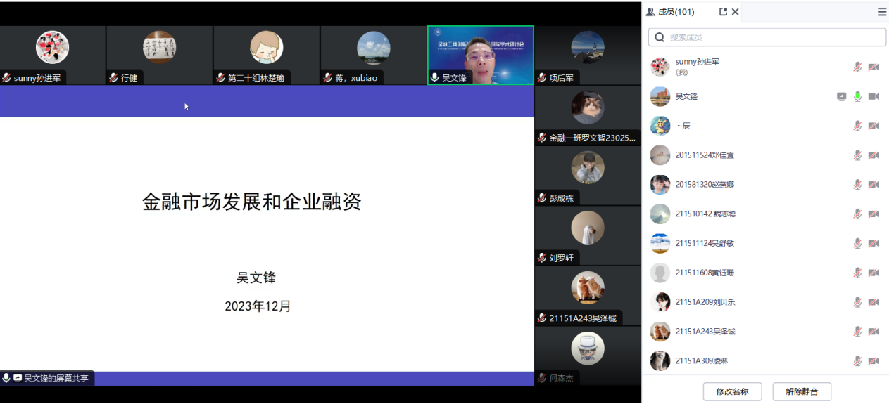2023年12月14日晚上,9428cn太阳集团古天乐通过腾讯会议线上举行“金融大讲堂”学术讲座。本次讲座邀请了教育部长江学者特聘教授、教育部金融类教学指导委员会委员、上海交通大学安泰经管公司吴文锋教授,为公司师生主讲《金融市场发展与企业融资》专题讲座。易行健副董事长、9428cn太阳集团古天乐项后军经理对吴文锋教授主讲本次金融大讲堂表示欢迎和感谢,对各位积极参加学术活动的师生表示热烈欢迎。9428cn太阳集团古天乐刘昊虹副经理和孙进军副经理参加讲座,蒋序标教授主持讲座。