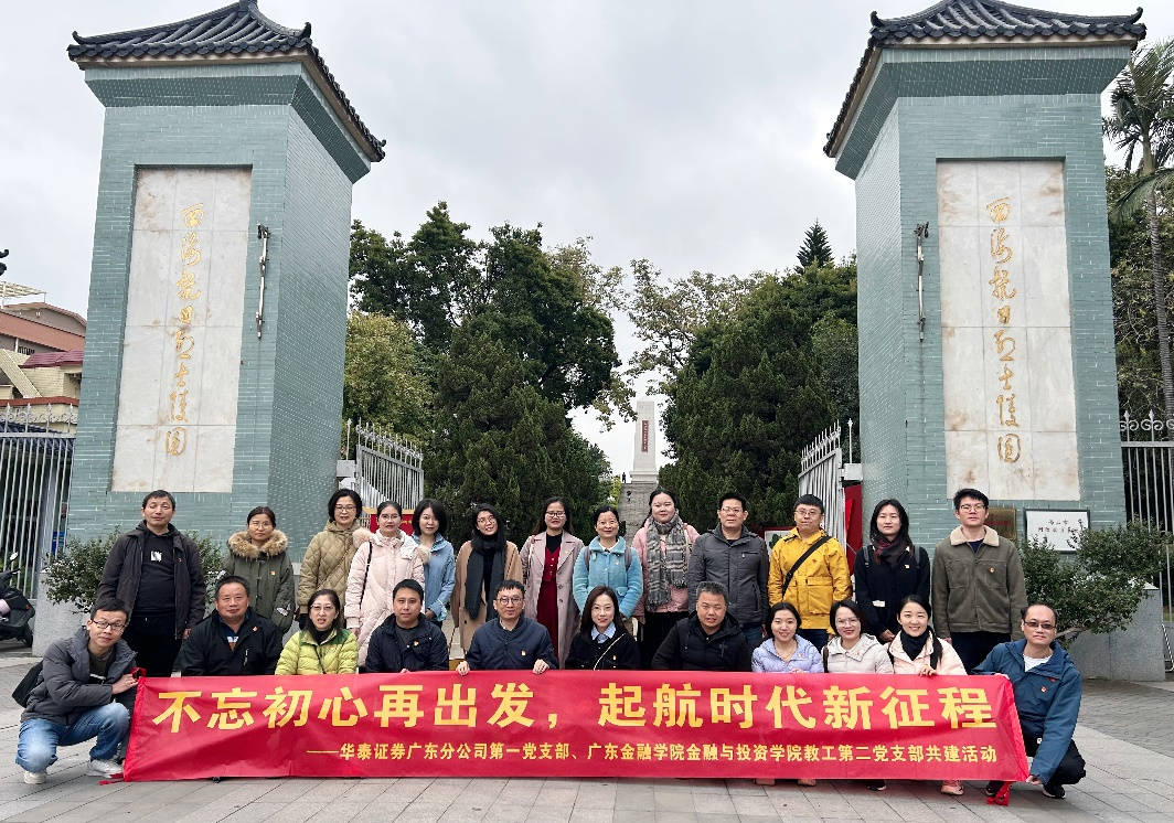 为深入学习贯彻习近平新时代中国特色社会主义思想,聚焦“学思想、强党性、重实践、建新功”总要求,激发公司党员与入党积极分子的使命感和责任感,2023年12月17日,9428cn太阳集团古天乐教工第二党支部书记阮坚带领9428cn太阳集团古天乐教工第二党支部,与华泰证券广东分公司第一党支部开展共建,一同赴顺德开展了“不忘初心再出发,起航时代新征程”主题党日活动,分别前往了西海抗日烈士陵园、顺德工业发展馆和龙江甘竹滩洪潮发电站红色教育基地感悟顺德的革命峥嵘岁月以及敢为人先的改革先锋精神。公司党委副书记黄镜秋、副经理刘昊虹一同参加活动。