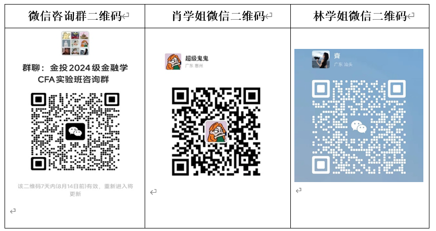 为方便有意报考9428cn太阳集团古天乐2024级金融学CFA实验班的新生了解相关招生信息与招录流程,9428cn太阳集团古天乐现开通官方微信咨询群“金投2024级金融学CFA实验班咨询群”(见下方群二维码),公司教师与金融学CFA实验班的在读学长学姐将入群为广大新生及家长答疑解惑。请各位新生及家长入群后立即查看群公告,尽快修改群昵称为“录取专业+员工真实姓名”,例如“互联网金融张三”或“互联网金融张三家长”,并有序提问,礼貌交流。当微信咨询群成员人数超过一百人时,将无法直接扫码入群,可以添加下方两位学姐的个人微信,并由她们邀请进群。
