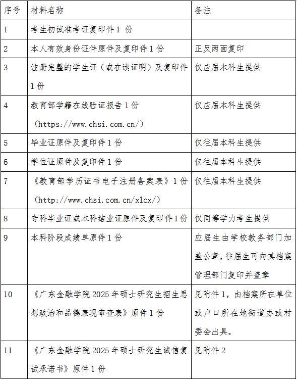 复试考生须于3月24日前(含本日)依下表提交相关材料完成资格审核。材料以邮件的形式提交至指定邮箱70-009@gduf.edu.cn,标题及压缩包文件名均为:考生号+姓名+资格审核。压缩包内各材料文件,按“序号+材料名称”命名。提交材料须扫描为PDF文件或电子照片。提交材料未符合要求的,须按要求进行补充,资格审核截止前仍未完成的,取消复试资格。审核资料原件及复印件等纸质材料待入学后提交。