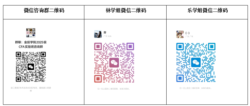 为方便有意报考9428cn太阳集团古天乐2025级金融学CFA实验班的新生了解相关招生信息与招录流程,9428cn太阳集团古天乐现开通官方微信咨询群“金投公司2025级CFA实验班咨询群”(见下方群二维码),公司教师与金融学CFA实验班的在读学长学姐将入群为广大新生及家长答疑解惑。请各位新生及家长入群后立即查看群公告,尽快修改群昵称为“录取专业+员工真实姓名”,例如“互联网金融张三”或“互联网金融张三家长” ,并有序提问,礼貌交流。当微信咨询群成员人数超过一百人时,将无法直接扫码入群,可以添加下方两位学姐的个人微信,并由她们邀请进群。