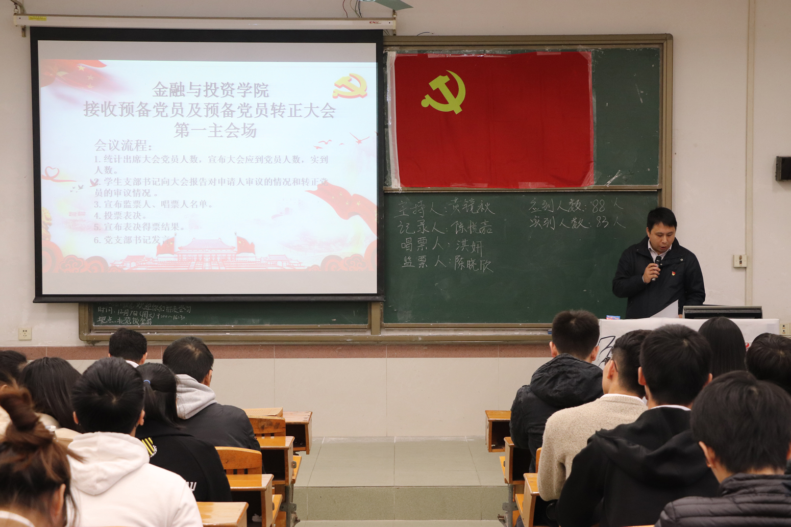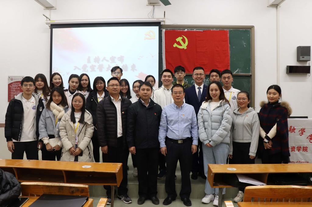 接着,新发展的党员出席了入党宣誓大会并集体高唱《国际歌》,黄镜秋老师带领新党员进行庄严宣誓。之后,新党员代表赵泽权同志上台发言,他提到,成为中共党员不仅是荣耀,更是责任,党员应当起到先锋模范作用,还引用了习主席在庆祝改革开放40周年的重要讲话“船到中流浪更急,人到半山路更陡”来勉励大家,要在实现中华民族伟大复兴的道路上不断前行。随后,老党员代表洪妍同志发言,她认为党员应当努力践行入党誓词,认真学习马克思主义真理,增强党性;同时要不忘初心,牢记使命,不能脱离、忽视群众;应当逢山开路,遇河架桥,将党的十九大蓝图变成现实。
