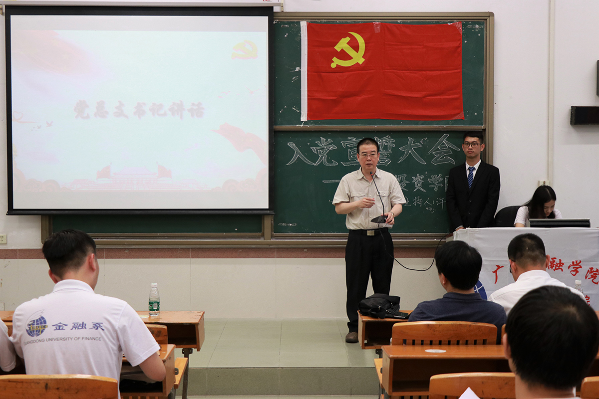 紧接着,党总支周少龙书记发表讲话。周书记先是代表党总支表示对39名新发展党员的热烈祝贺,他向党员强调要珍惜大学入党机会,并表明“党员”对个人来说是极其重要的标签,是新时期的先锋表率。同时,周书记对新党员提出了三点要求:一是坚定理想信念,严格要求自己,坚定不移以党的旗帜为旗帜;二是不忘初心、牢记党员身份,强调党员的职责和新时代的伟大使命;三是不断学习,起标杆作用,他多次强调学习的重要性,党员要在学习中起模范作用,带领有入党意愿的同学向党组织靠拢,在创建公司的学风、考风中努力作为,积极贡献。