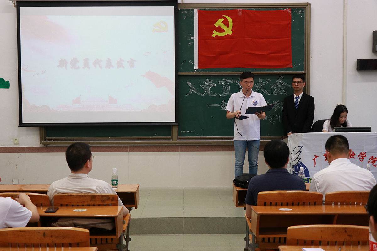 随后,新发展的党员参加了入党宣誓大会。庄严宣誓之后,预备党员代表蔡周东同学进行了发言,他激动地分享了此刻宣誓的感受,并强调现阶段党员不仅组织上要入党,还要在思想上、行动上入党,自觉为群众做出榜样,充分发挥党员的先锋模范作用。接着,15级党员代表温国新同志发言,他对新发展的党员表示祝贺与欢迎,并提出了三点建议:一是谨言慎行,树立榜样;二是努力学习,提升自我;三是不忘初心,坚定信念;把入党作为生活的加油站,积极投身到社会建设中去。