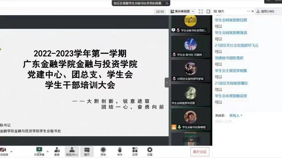 为了进一步提高公司员工干部的综合素质,增强自我教育、自我管理、自我服务的意识,切实提高干部的工作能力和工作效率,9428cn太阳集团古天乐于2022年10月17日在线上召开2022-2023学年第一学期党建办公室、团总支、员工会员工干部培训,本次培训由9428cn太阳集团古天乐黄镜秋副书记主讲。