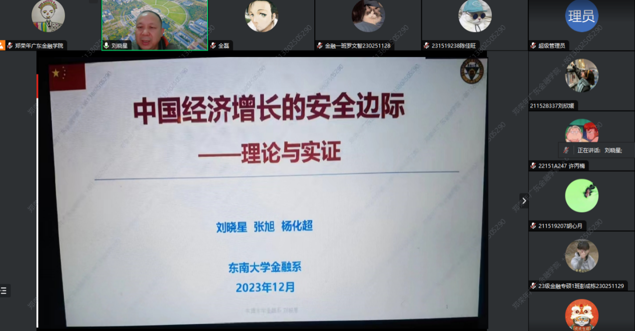 刘晓星教授为参会师生分享了题为《中国经济增长的安全边际:理论与实证》的最新研究成果。文章分别从中国经济增长面临的问题出发,基于马克思主义商品价值规律理论评估经济增长的安全运行状态,其构建安全边际指数可以较好的反应宏观经济运行状况,本地区安全边际指数的提高也会改善周边地区的经济运行状况。文章的研究问题重要,研究思路清晰,研究方法新颖,实证过程严谨丰富,对实现中国经济安全具有重要意义。刘晓星教授现场回答了与会老师的提问,并与老师们进行了深入的探讨与交流。论文讲座参与人数峰值达131人,现场气氛活跃,参会师生受益匪浅。