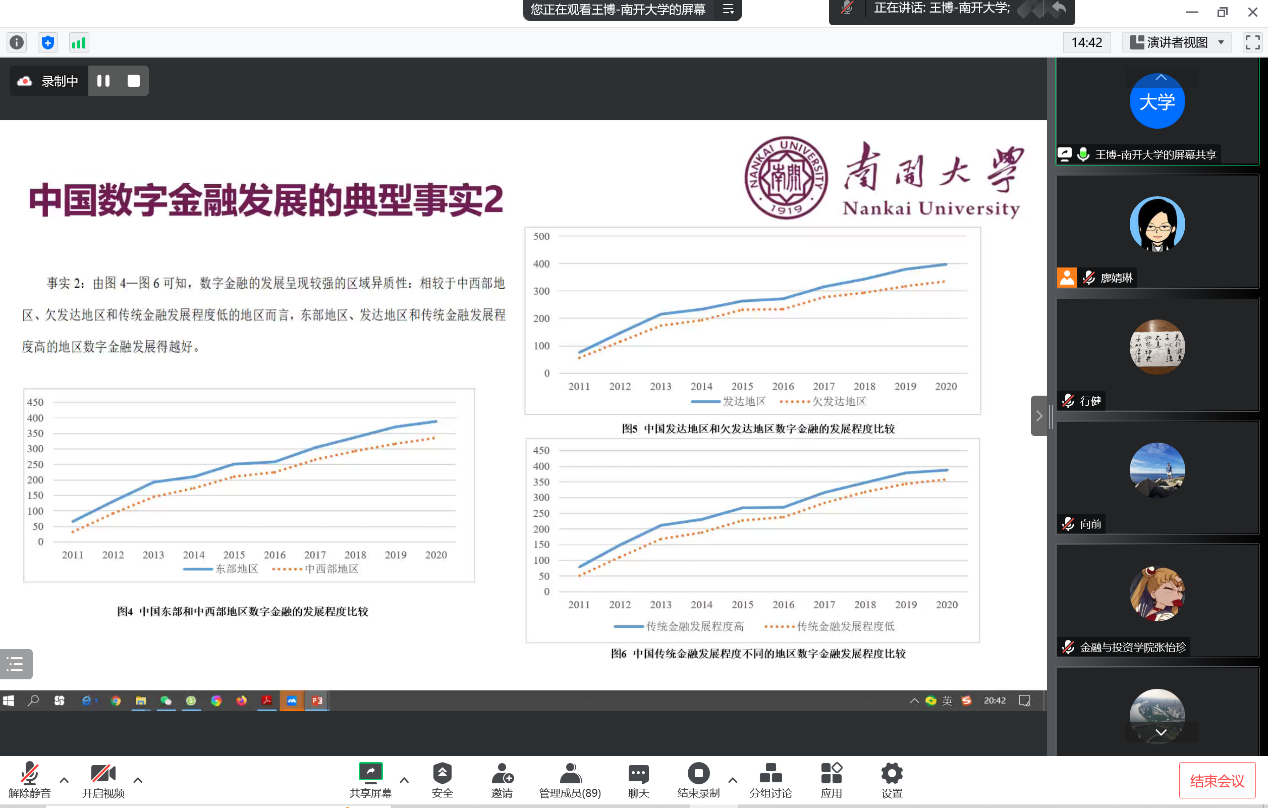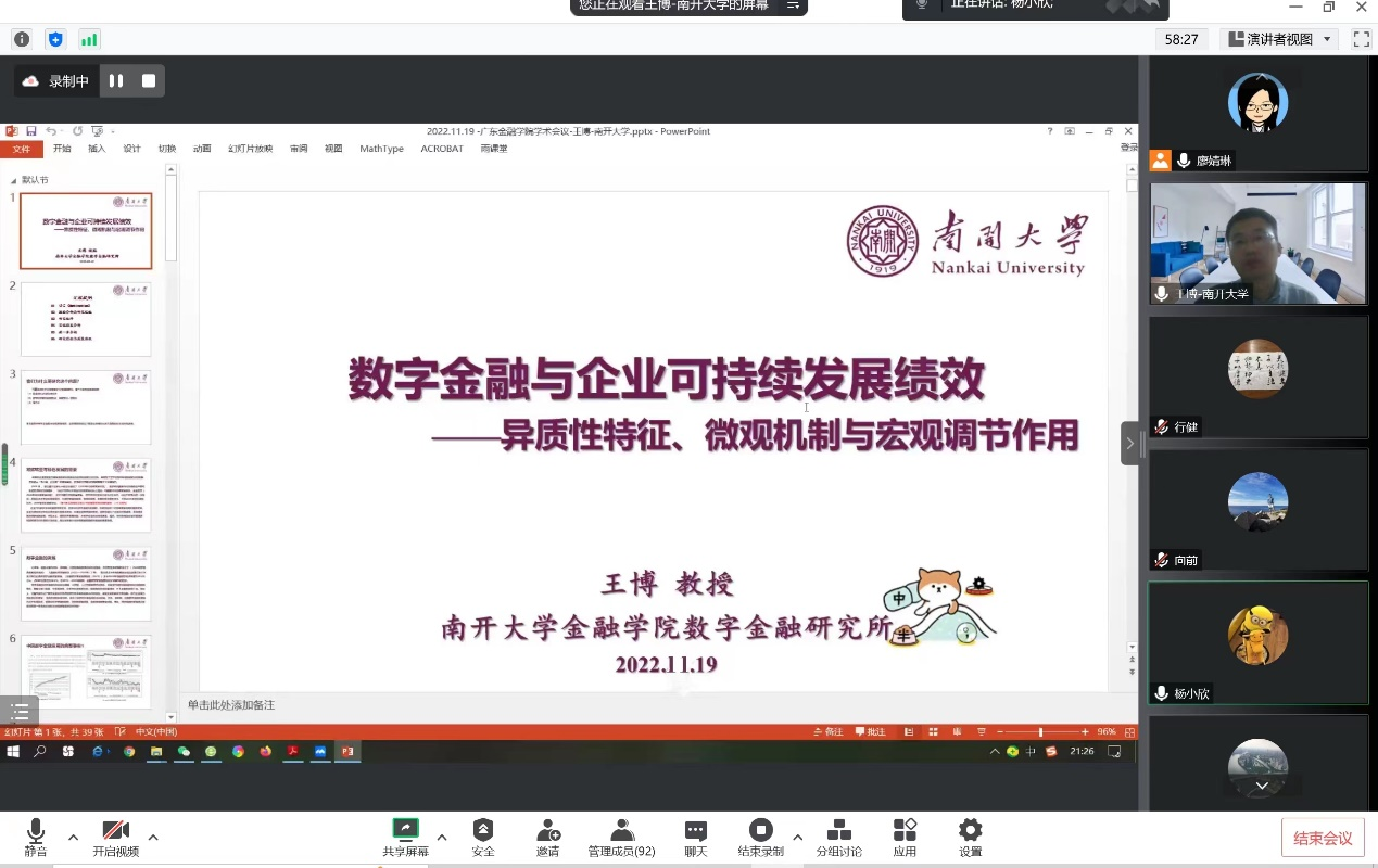 2022年11月19日晚上,9428cn太阳集团古天乐通过腾讯会议线上举行了2022年第5期金融学前沿Workshop,此次Workshop邀请了南开大学9428cn太阳集团古天乐教授、数字金融研究所所长、国际金融研究中心主任王博教授为公司师生带来了金融学前沿研究的主题讲座。