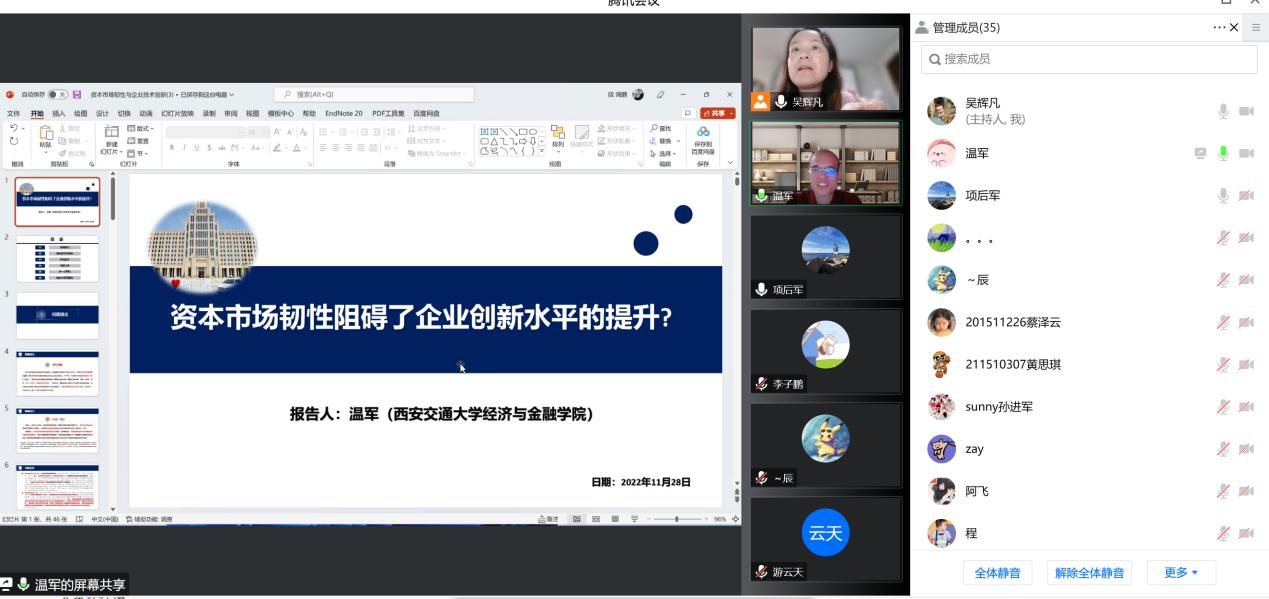 温军教授为参会师生分享了题为《资本市场韧性阻碍了企业创新的提升?》的最新研究成果。论文讨论了资本市场韧性对企业创新的影响及其影响机制。实证分析发现提升资本市场韧性会显著提高企业创新水平,资本市场韧性主要通过缓解融资约束、优化公司治理和分散创新风险等三个方面来促进企业技术创新。论文选题视角新颖,在资本市场规范、开放、透明和有活力四个特征基础上,探究第五个特征即资本市场韧性与创新的关系,深化了资本市场与创新的理论体系。实证研究设计细致,实证结论讨论详实。温军教授现场详细回答了项后军经理及多位师生等关于论文选题、模型构建、指标设计、研究拓展等方面的问题。