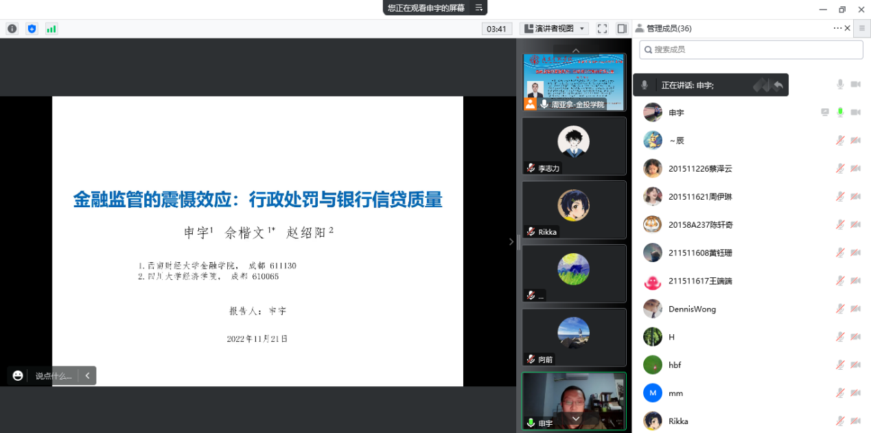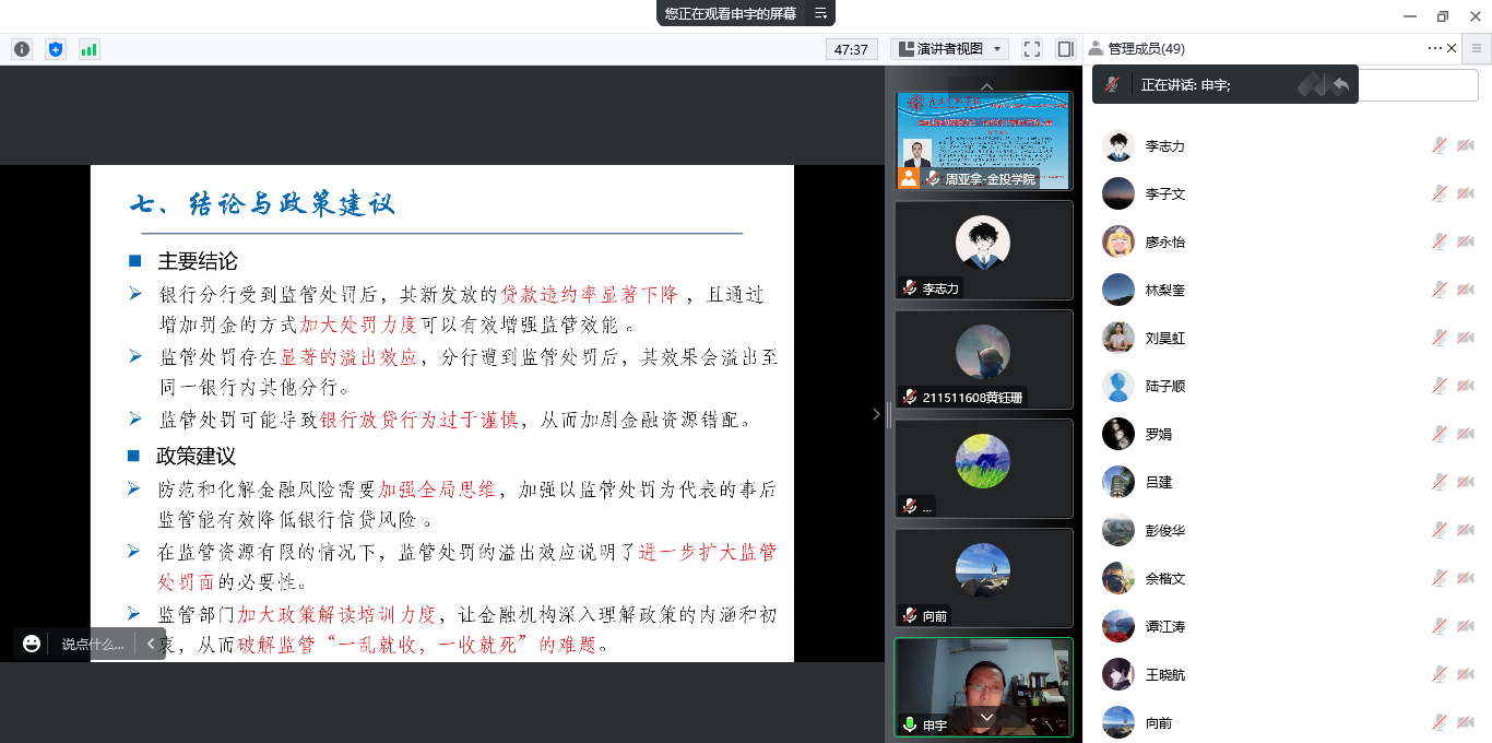 申宇副教授为参会师生分享了题为《金融监管的震慑效应:行政处罚与银行信贷质量》的最新研究成果。文章讨论了监管处罚对银行信贷质量的影响及其微观作用机理和经济后果,发现银行受到监管部门处罚后,贷款违约率显著下降,且通过罚金或没收违法所得,可以进一步提升监管效能,降低银行信贷风险。机制检验发现,银行通过选择风险更小的借款人,发放期限更短的贷款以控制贷款违约率;同时,银行也挤出了缺乏信贷足迹的借款人。监管处罚的效果会外溢至同一银行内的其他分行,降低了其他分行的贷款违约率。申宇副教授现场回答了项后军经理以及多位师生关于文章的模型构建、异质性分析、样本区间与变量衡量方式等方面的诸多问题。