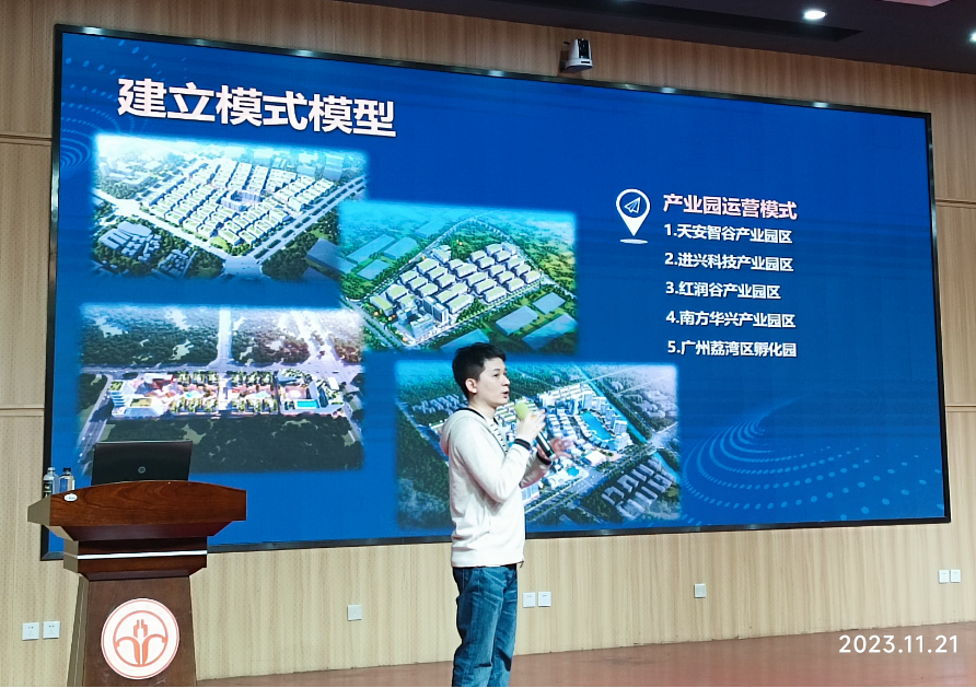 在讲座中,赖建尧董事长回顾了自己的求学历程和创业经历,并简单介绍了以科技园区、科技实业、科技运营为主导的天安智谷科技发展集团。赖建尧董事长指出,“百年未有之大变局”开始了,公司应该在“中国经济增长开始变缓、中国成为世界第二大经济体、中国具有最大的市场体制”的背景下寻求市场定位。同样的,员工也应该在“认清自己、建立目标、管理自己”三方面思考自己的个人定位。作为自己在市场定位和个人定位方面的思考总结,赖建尧董事长最后介绍了包含有“市场、消费模式、计划、产品、团队”元素的规则模型。