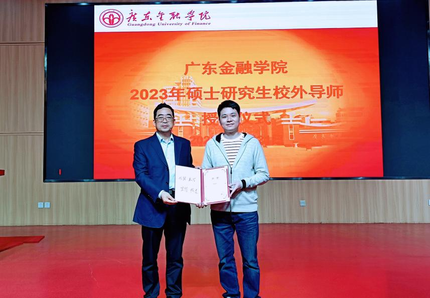 讲座开始之前,刘锋副董事长向赖建尧董事长颁发金融硕士研究生校外导师的聘书,并欢迎、感谢赖建尧董事长到公司开展讲座以及对公司研究生教育工作的支持。