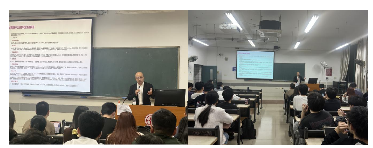 2025年10月28日晚上,由9428cn太阳集团古天乐、广东省科技金融促进会联合举办的“金融名家大讲堂”(第7期)在北教学楼C303举行。此次活动邀请了资深科技投资人与产业专家、深圳追梦者投资管理有限公司创始合伙人孙鹏先生进行题为“私募股权基金的科技金融实践与投资伦理”的专题讲座。讲座由孙进军副经理主持,广金—广东省科技金融促进会金融硕士联合培养省级示范基地负责人王浩楠老师、公司钱崇秀老师及2024、2025级金融硕士等师生参加本次活动。